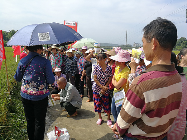 合作伙伴陳桂英對晶兩優(yōu)1212田間管理進(jìn)行講解