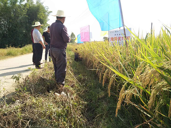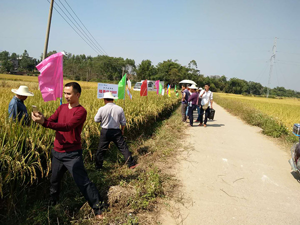 2017年11月3日早晨7點廣西賀州市鋪門鎮(zhèn)南華村忽然熱鬧起來,原來是鋪門鎮(zhèn)隆兩優(yōu)1988經(jīng)銷商陳美香邀請了鋪門鎮(zhèn)種植大戶和水稻種植合作社的老板們前來田間觀摩財神稻,首先,代理商梁總介紹,這塊田的戶主是一對年過7旬的老人家,因老人家精力不足所以在田間管理與施肥方面相對缺乏,只靠田塊原本的肥水條件自然生長,但隆兩優(yōu)1988的長勢和表現(xiàn)卻遠(yuǎn)遠(yuǎn)超越周邊的其它品種,這使農(nóng)戶們驚嘆不已!