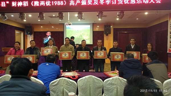 2017年11月11日上午9:30,伴隨著雙十一這個中國原創(chuàng)節(jié)日,大家忙于網(wǎng)上搶購,安鄉(xiāng)也迎來了種植大戶有史以來第一屆財神稻購物節(jié),現(xiàn)場91位來自安鄉(xiāng)各個鄉(xiāng)鎮(zhèn)的種植水稻大戶齊聚安鄉(xiāng)五一國際酒店參加財神稻2016-2017年度高產挑戰(zhàn)賽頒獎典禮及財神稻雙十一訂購會。