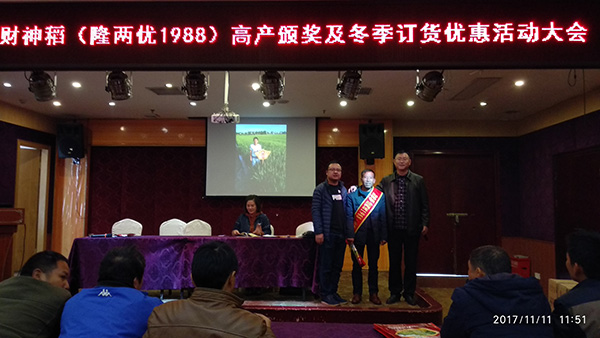 緊接著進入激動人心的時刻,財神稻高產挑戰(zhàn)賽頒獎,經過激烈的高產競爭,最終由劉老板等9名種植大戶每人各獲得財神稻高產挑戰(zhàn)賽高檔電飯煲一臺,看著種植戶滿臉笑容,種財神稻就對了。最終免費坐飛機游泰國大獎由流轉土地2000畝,2017年財神稻800畝,平均1600斤/畝,沒有倒伏的譚老板斬獲現(xiàn)場頒獎結束,宋總宣布今年財神稻訂購優(yōu)惠政策,現(xiàn)場預訂開始,短短20分鐘預訂10000多斤,最終訂購13000斤。