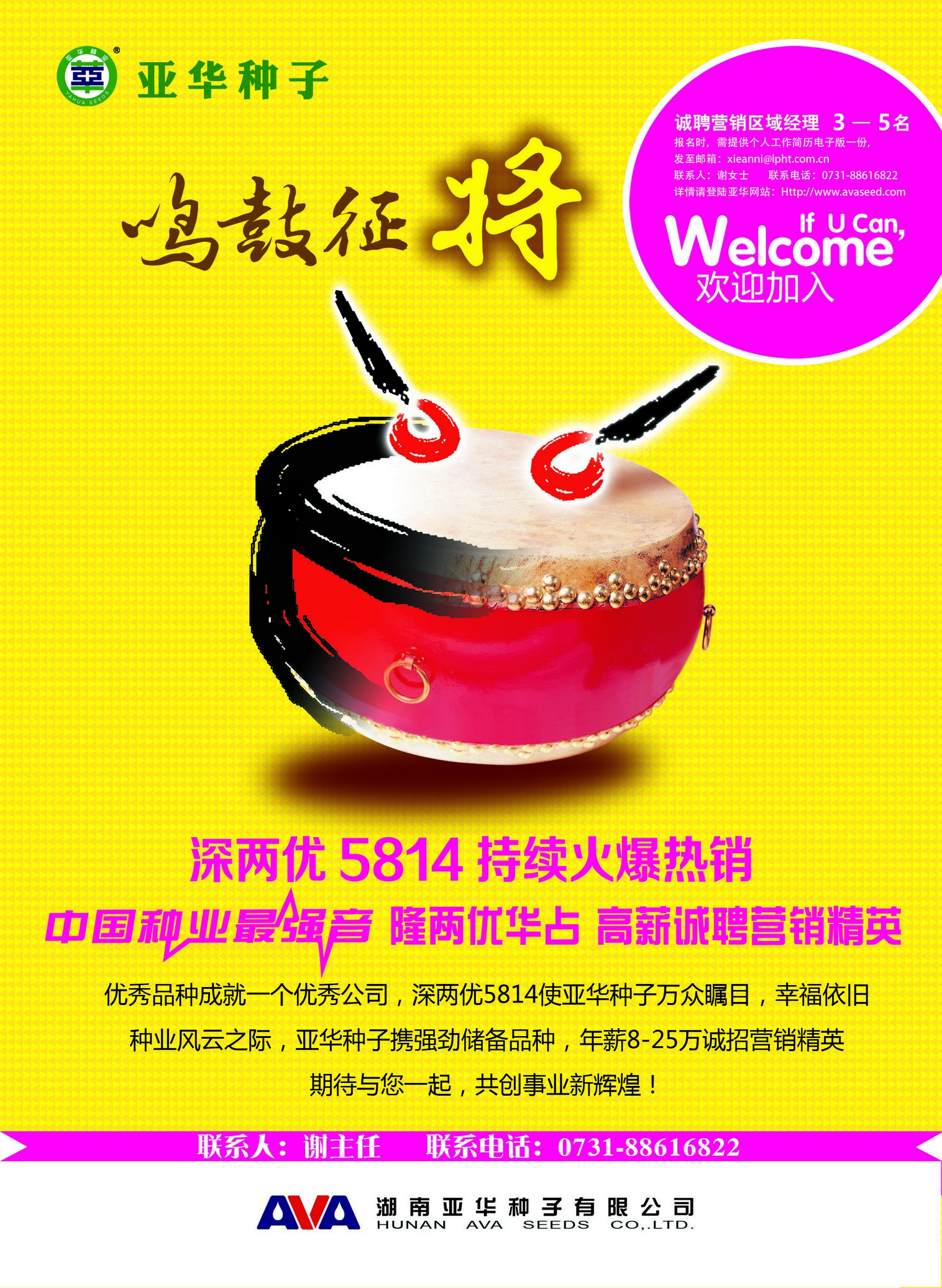 亞華種業(yè)誠聘營銷區(qū)域經(jīng)理3-5名,報(bào)名時(shí)請?zhí)峁﹤€(gè)人工作簡歷電子版一份,發(fā)送至郵箱: xieanne@126.com 聯(lián)系人:謝主任 聯(lián)系電話:0731-88616822