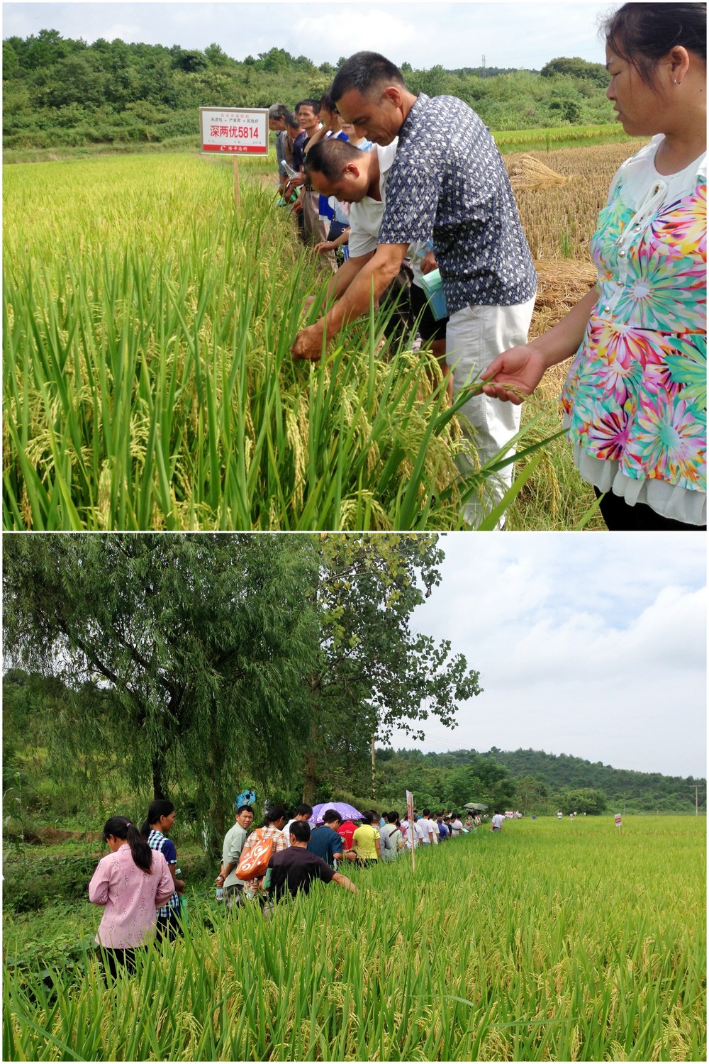 2015年9月4日,祁陽代理商曹寒鐵先生組織祁陽縣100多位鄉(xiāng)鎮(zhèn)種子經(jīng)銷商及種植大戶來到祁陽縣觀音灘鎮(zhèn)聯(lián)興村,現(xiàn)場觀摩該村種植大戶莫學(xué)森連片直播100多畝的農(nóng)業(yè)部超級稻-深兩優(yōu)5814大田,100多號人深入現(xiàn)場,看著金黃的稻穗,大家都說“真正見識到高手種植好品種的現(xiàn)場”,個(gè)個(gè)夸贊好。種植戶莫學(xué)森介紹說“2014年我也直播了60畝深兩優(yōu)5814,品種表現(xiàn)好,賺了錢,今年擴(kuò)大面積繼續(xù)直播深兩優(yōu)5814,現(xiàn)在田間表現(xiàn)基本穩(wěn)定了,肯定能賺錢”!觀摩的大戶仔細(xì)查看品種表現(xiàn),對照自己的種植的情況,詳細(xì)向種植戶打聽技術(shù),盤算著明年的播種計(jì)劃。