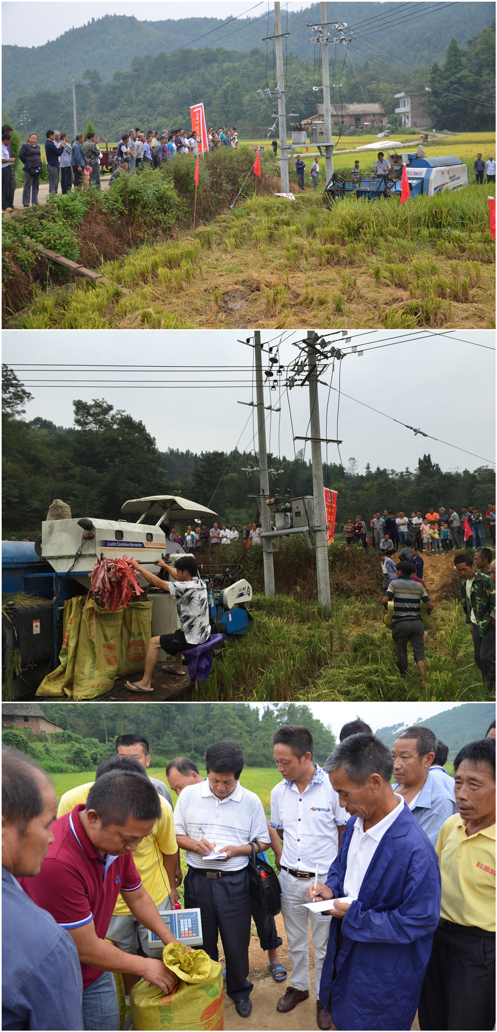 測產(chǎn)正式開始前,現(xiàn)場隨機選取了幾位農(nóng)戶代表對田間面積進行了測量,并檢查了收割機以保證測產(chǎn)的真實性。伴隨著機器的轟鳴聲,測產(chǎn)也拉開序幕,收割完畢后現(xiàn)場進行稱量,很多農(nóng)戶包括收割機手都表示這個品種確實不錯,比其他品種產(chǎn)量都要高。事實證明,隆兩優(yōu)華占的產(chǎn)量名不虛傳,現(xiàn)場收割0.56畝,實收濕谷984斤,折合干谷近1500斤/畝。現(xiàn)場還有一位來自農(nóng)業(yè)局的高級農(nóng)藝師,他看了之后說:這個品種結(jié)實率很高,如果這塊田管理上再用些工夫,產(chǎn)量會更高。
