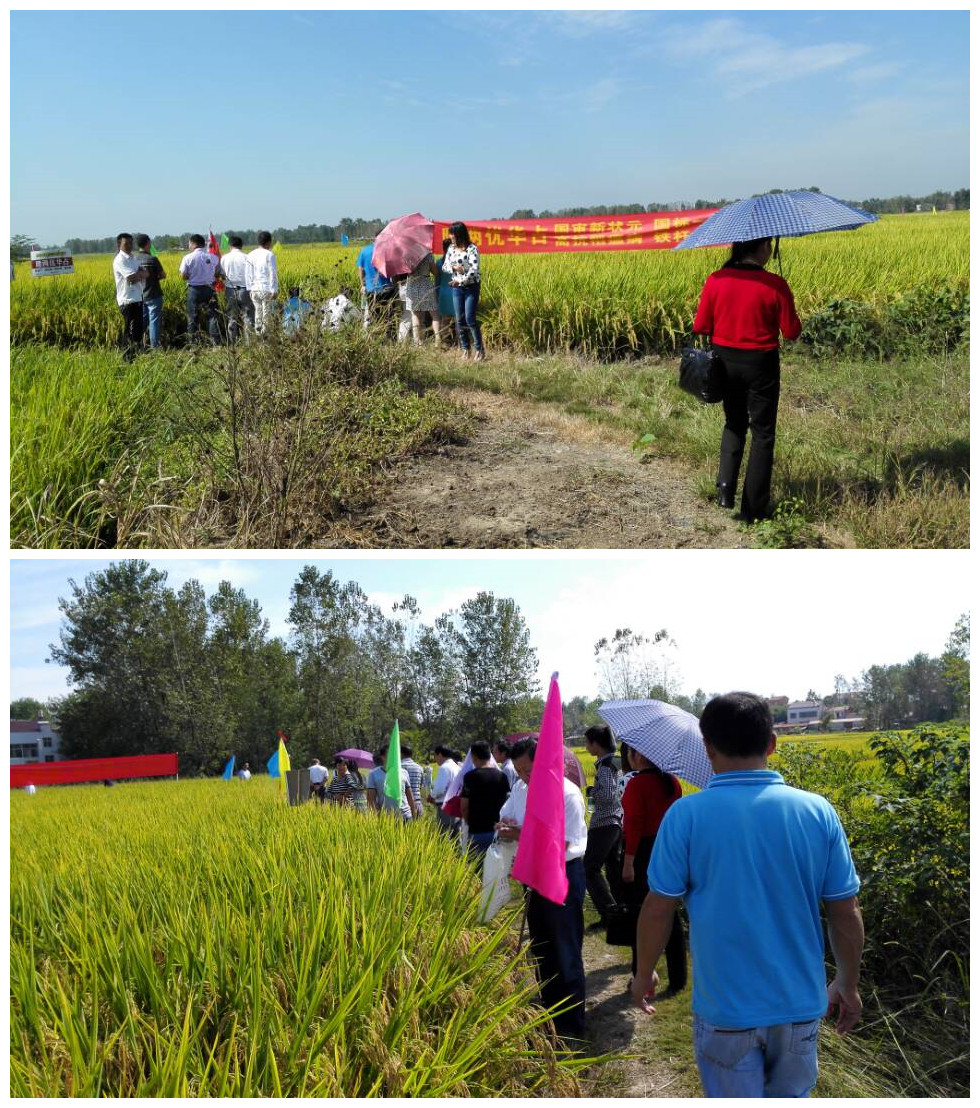 2015年9月14日,50余位零售商歡聚隨州歷山鎮(zhèn)沙城村,只為一睹隆兩優(yōu)華占豐收的美景。上午八點(diǎn),零售商們已環(huán)繞在觀摩田畔,各自仔細(xì)查看著隆兩優(yōu)華占的每一項(xiàng)表現(xiàn):抗病性、抗倒性、分蘗能力、米質(zhì)等等,還詢問了水肥管理情況。因?yàn)榇蠹覍β蓛?yōu)華占懷著很高的期望值,所以眼光更加犀利、標(biāo)準(zhǔn)更加嚴(yán)苛,隆兩優(yōu)華占以它完美表現(xiàn)迅速折服了在場的客戶們——有效分蘗數(shù)在18至22之間,標(biāo)準(zhǔn)畝產(chǎn)干谷1500以上,并且完全沒有稻瘟病的現(xiàn)象,其優(yōu)異的表現(xiàn)與附近其他發(fā)病或倒伏情況嚴(yán)重的品種形成了鮮明的對比。尚市零售商嚴(yán)總在觀看后說:“隆兩優(yōu)華占在整個隨州表現(xiàn)都特別優(yōu)秀,完全不需要找示范田,隨便哪塊田都可以拿來做示范,都可以插牌子!”