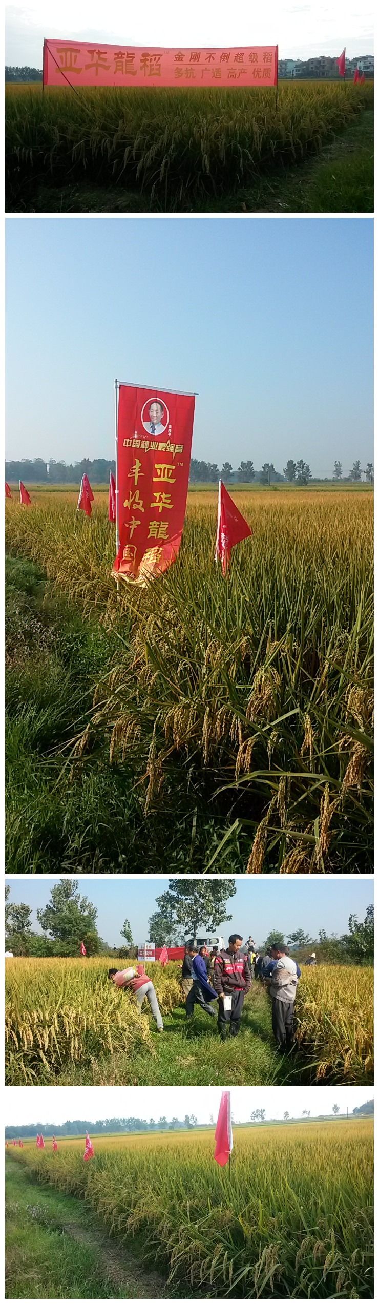 2015年10月15號(hào),在江西萬年縣湖云鄉(xiāng)白馬村,迎面而來的是彩旗飄飄、稻浪滾滾的示范田,就在這番美景之中順利召開了亞華龍稻現(xiàn)場(chǎng)觀摩會(huì)。人們不由自主地下到田邊、田中去近距離地觀看和親近這美景。人們仔細(xì)地觀看后說:“這品種結(jié)實(shí)率真高!到穗頸處的谷粒都是個(gè)個(gè)飽滿”“亞華龍稻的發(fā)蔸能力真強(qiáng),平均有15根,按照這田間表現(xiàn)收割定是大豐收”!