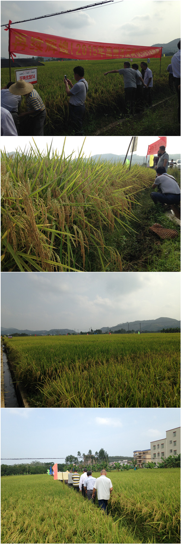 2015年10月31日,湖南亞華種子有限公司代理商之一的鄭信權(quán),組織高州各個(gè)鄉(xiāng)鎮(zhèn)核心零售商,來(lái)到了位于廣東高州東岸鎮(zhèn)的百畝連片深兩優(yōu)5814示范片現(xiàn)場(chǎng)觀摩,查看“彩虹”過(guò)后的大田表現(xiàn)。