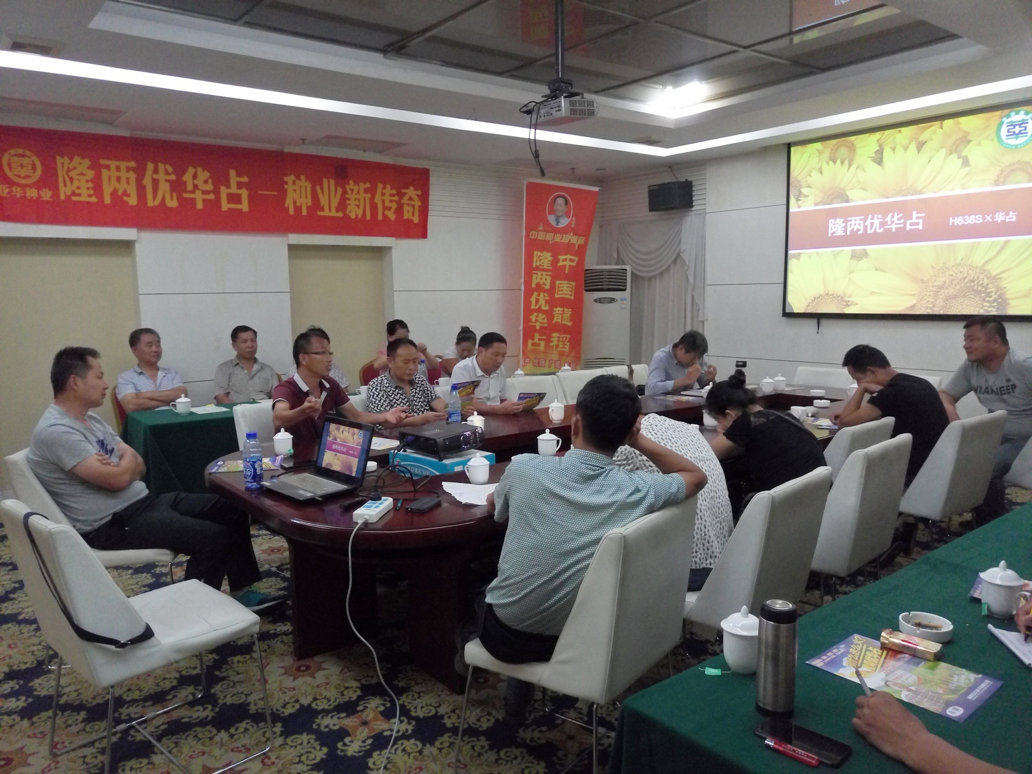 田間觀摩后,來到會(huì)議室。首先,由湖南亞華種子有限公司黃凱經(jīng)理,給大家介紹公司背景實(shí)力、研究水平和運(yùn)營(yíng)情況,以及隆兩優(yōu)華占特征特性、高產(chǎn)挑戰(zhàn)賽、強(qiáng)調(diào)市場(chǎng)秩序管控。然后,經(jīng)銷商代表?xiàng)钽y才和段方平發(fā)言,分別對(duì)隆兩優(yōu)華占這兩年種植情況做評(píng)價(jià),表示隆兩優(yōu)華占是個(gè)好品種、大品種,在高溫天氣還能有這么高的結(jié)實(shí)率,楊老板還把自己抽樣數(shù)的結(jié)實(shí)率公布給大家,結(jié)實(shí)率為90.0%。