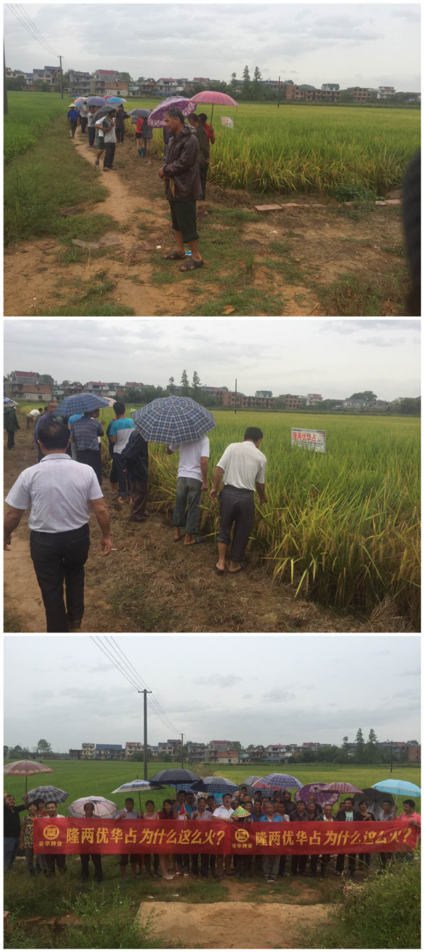 2015年9月28號(hào),受臺(tái)風(fēng)“鲇魚(yú)”的影響,江西省各管轄市基本都淪陷于狂風(fēng)暴雨中。盡管風(fēng)雨再大,也阻擋不了種植戶對(duì)豐收的渴望。上午十點(diǎn)左右,貴溪市泗瀝鎮(zhèn)迎來(lái)了各個(gè)鄉(xiāng)鎮(zhèn)的40多位零售商和種植大戶,來(lái)參加由湖南亞華種業(yè)組織的中國(guó)種業(yè)超強(qiáng)音——隆兩優(yōu)華占觀摩會(huì)。