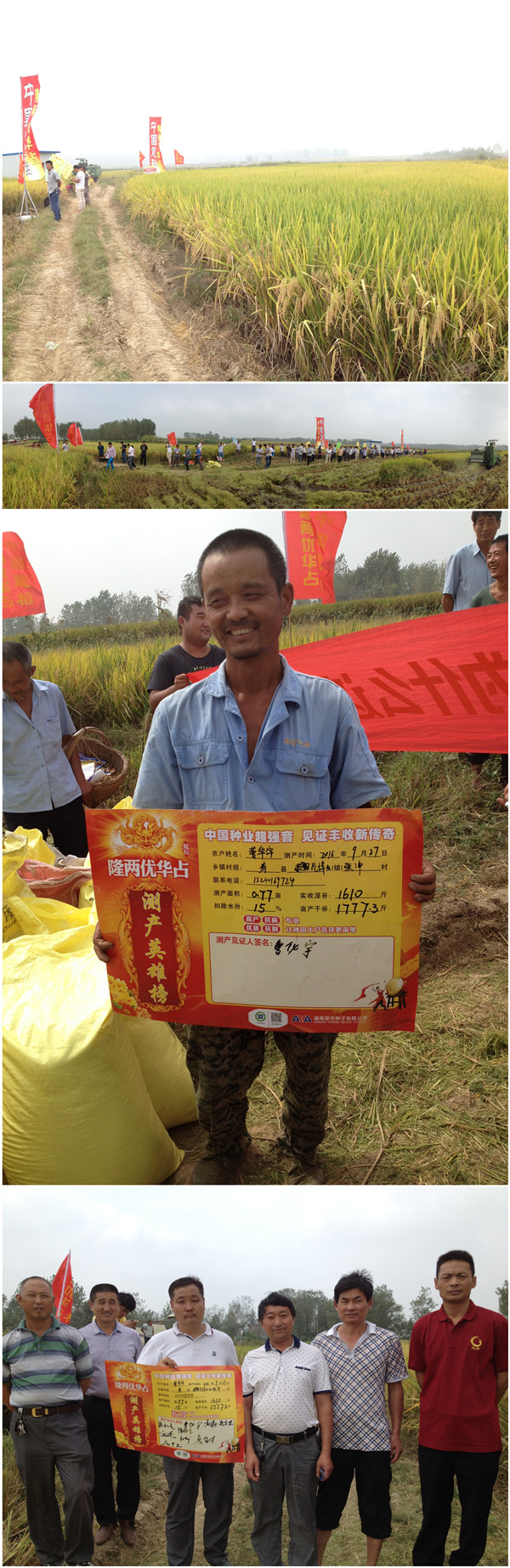 上午10時(shí)許,這里的田間地頭彩旗飄揚(yáng),人頭攢動(dòng)。中國龍稻——“隆兩優(yōu)華占”田間實(shí)測產(chǎn)活動(dòng)如約開展,一百三十多人現(xiàn)場監(jiān)督見證了0.77畝實(shí)收濕谷1610斤,測得畝產(chǎn)濕谷2090.9斤,扣除15%水分,實(shí)測干谷1777.3斤/畝,現(xiàn)場參會(huì)人員無不對(duì)隆兩優(yōu)華占的表現(xiàn)心悅誠服,紛紛表示由種田大戶粗放式管理在極端天氣下獲得這樣高的產(chǎn)量,真是不可思議。