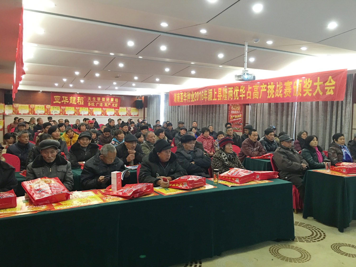 在隆兩優(yōu)華占高產(chǎn)農(nóng)戶還沉靜在豐收帶來的喜悅之際,2016年12月10日,潁上縣田立山總經(jīng)理組織當(dāng)?shù)亓闶凵毯透弋a(chǎn)農(nóng)戶代表110多人,在潁上縣徽泰國際大酒店高規(guī)格、高格調(diào)召開了湖南亞華種業(yè)潁上縣隆兩優(yōu)華占高產(chǎn)挑戰(zhàn)賽一等獎(jiǎng)、二等獎(jiǎng)的頒獎(jiǎng)大會(huì)。在一百多人的共同見證下達(dá)到了高效果的反響。