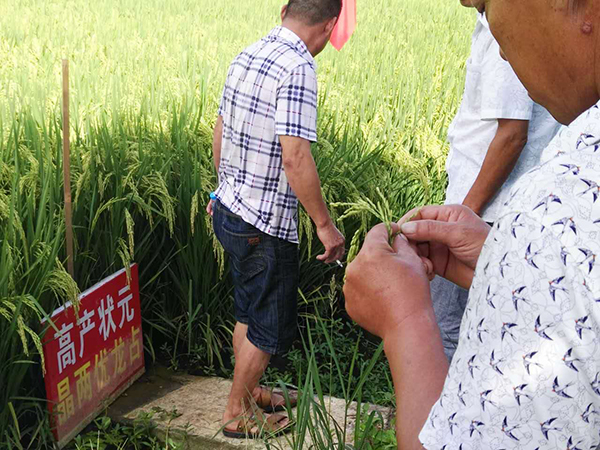 首先由亞華種業(yè)胡軒經(jīng)理及相關(guān)工作人員帶領(lǐng)農(nóng)戶去晶兩優(yōu)龍占示范田觀摩,讓農(nóng)戶對(duì)品種有直觀而確切的了解。今年晶兩優(yōu)龍占在孕穗和抽穗期全程經(jīng)歷高溫,但依然抽穗齊,結(jié)實(shí)率高,有農(nóng)戶隨機(jī)數(shù)了稻穗的實(shí)粒數(shù)有280粒,實(shí)地驗(yàn)證了品種的高產(chǎn)特性。隆兩優(yōu)龍占分蘗強(qiáng)、抗性好、耐高溫等特性大家有目共堵,優(yōu)異的田間表現(xiàn)得到了農(nóng)戶們的一致好評(píng)。