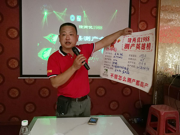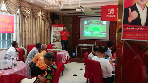 測產(chǎn)會(huì)后,在洪山鎮(zhèn)零售商胡老板的主持下召開室內(nèi)會(huì)議,會(huì)議首先由百分農(nóng)業(yè)湖南財(cái)神線經(jīng)理陳鋒就百分農(nóng)業(yè)概況、財(cái)神稻在全國各區(qū)域的表現(xiàn)、高產(chǎn)賽等情況給在場的觀摩人員進(jìn)行了介紹與講解。之后與會(huì)的零售商和種植大戶就財(cái)神稻的種植要點(diǎn)以及田間管理要求進(jìn)行了交流。會(huì)場十分火爆,有種植大戶之前對(duì)品種選擇十分猶豫,70多畝田選了好幾個(gè)品種種植進(jìn)行對(duì)比,財(cái)神稻高抗病、耐高溫、高抗倒的表現(xiàn)在田間表現(xiàn)得淋漓盡致,所以種植大戶說明年只種財(cái)神稻。