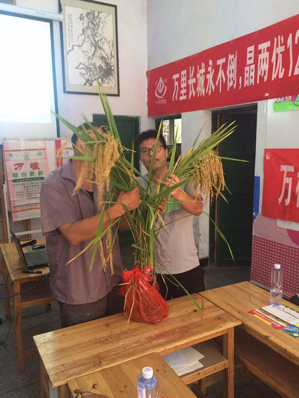 下午進(jìn)行了室內(nèi)會議,由張洋經(jīng)理給大家從“分蘗力、抗病性、肥力水平、米質(zhì)”等八個方面對晶兩優(yōu)1212進(jìn)行了講解,得到了零售商們的高度贊同。接下來,晶兩優(yōu)1212縣級代理羅總進(jìn)行了總結(jié),他表示非??春镁蓛?yōu)1212,無論是米質(zhì)、抗性還是生育期都非常適合在洞口地區(qū)進(jìn)行推廣。會后,零售商們都紛紛表示明年要重點推廣這個品種。
