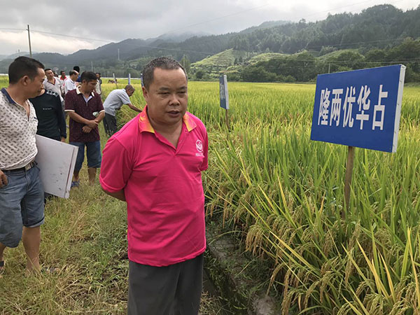 2017年8月30日上午,新晃縣亞華種業(yè)代理商吳克云在扶羅鎮(zhèn)組織了隆兩優(yōu)華占觀摩會(huì),前來(lái)觀摩的有農(nóng)業(yè)局領(lǐng)導(dǎo)、亞華種業(yè)婁懷區(qū)域經(jīng)理何少海、鄉(xiāng)鎮(zhèn)種子零售商及種田大戶。當(dāng)日烏云密布,但絲毫沒有影響大家的熱情。看著插有隆兩優(yōu)華占示范牌的田塊,所有人的目光都被它又長(zhǎng)又多的穗子吸引,種植戶得意地說(shuō),“從來(lái)沒有種過(guò)產(chǎn)量這么高的,今年是選對(duì)種了,這2畝田少說(shuō)要收3000斤谷”。
