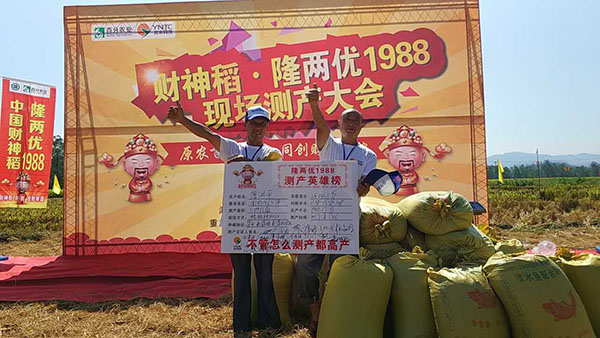 當(dāng)天,重慶各個(gè)區(qū)縣的水稻經(jīng)銷(xiāo)商、種糧大戶和村民代表等六七百人,通過(guò)到現(xiàn)場(chǎng)觀摩或在酒店觀看電視直播方式,一起見(jiàn)證了隆兩優(yōu)1988水稻在新盛鎮(zhèn)新盛村種植的情況。經(jīng)過(guò)對(duì)唐洪平種植的1.3畝水稻進(jìn)行機(jī)收測(cè)產(chǎn),平均畝產(chǎn)量達(dá)1965.27斤,成為梁平最高水稻畝產(chǎn)量,高出村民種植的常規(guī)水稻700斤左右。
