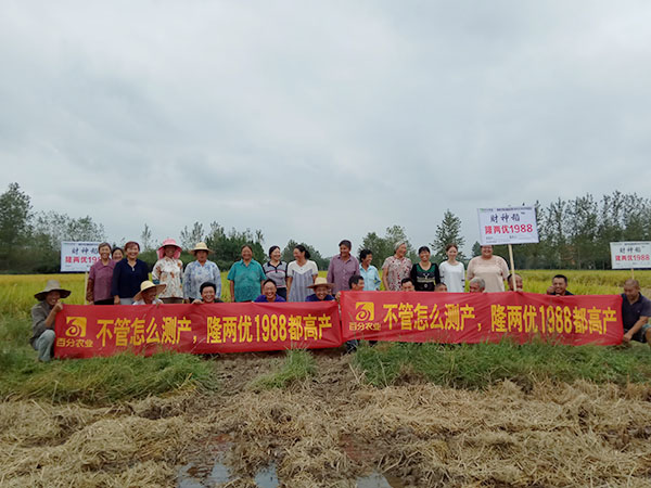 ?2017年9月5日,在湖北當陽廟前鎮(zhèn)清平河隆兩優(yōu)1988示范田邊,迎來了由財神稻代理商朱錦華組織的30位種植面積在20畝以上大戶,一起共同見證財神稻優(yōu)秀的表現。