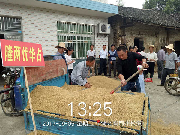 2017年9月5日,一場(chǎng)隆兩優(yōu)華占的觀摩測(cè)產(chǎn)會(huì)在松滋市楊林市鎮(zhèn)舉行。參加此次測(cè)產(chǎn)會(huì)的農(nóng)戶(hù)是附近村組的種田大戶(hù),他們放下手中的農(nóng)活,興致勃勃地參與其中。