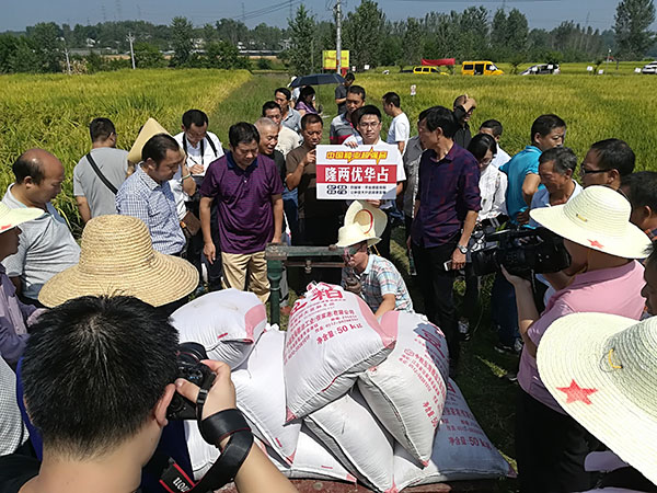 收獲的季節(jié),稻田里隆兩華占金燦燦的一片,緊實(shí)、飽滿的稻穗沉甸甸地彎了下來,伴隨著收割機(jī)的轟隆聲一畝田的稻谷很快就收割完畢,機(jī)器脫粒后分別裝袋,整體稱重再去除雜質(zhì)、水分,測(cè)算出一畝產(chǎn)量為734公斤。