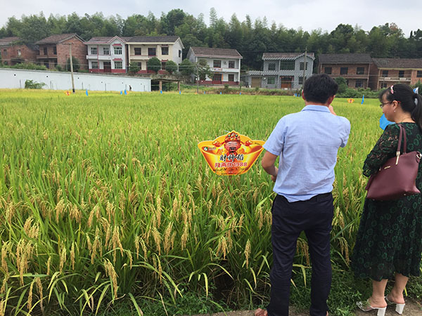 上午9點半左右,與會所有人員集合完畢,一行20余人驅車前往位于醴陵茶山鎮(zhèn)的隆兩優(yōu)1988種植田塊觀摩,定要讓大家眼見為實!10點多到達觀摩點,雖然烈日當頭,但還是擋不住零售商們的觀摩熱情,據該田塊的種植農戶反應,5月中下旬撒播,肥力水平一般,基本屬于粗放狀態(tài)。吳總說,這個觀摩田也是臨時找的,前面定的田塊農戶沒通知就收割了。來到示范田給零售商們的第一感覺就是:滿田都是谷子啊!再看看邊上幾塊田,要么葉瘟嚴重,要么有效穗不足、結實率低、空癟粒多,和財神稻根本不能比??剐詮姟⒏弋a穩(wěn)產、耐高溫、結實率高是財神稻的主要特點。零售商們紛紛拍照記錄,還有一個客戶甚至跑到田中間數有效穗,還隨便抽了幾穗谷子,自己在一旁蹲下來默默的開始數粒數了。事實勝于雄辯,看過之后無一不點頭稱贊的,這個好的品種怎么可能輕易錯過呢!