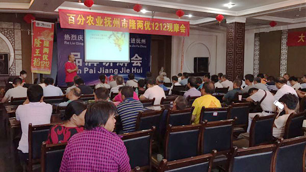 上午11點(diǎn)半,室內(nèi)會(huì)議準(zhǔn)時(shí)召開,首先由李寒晗經(jīng)理做了簡短的公司介紹,讓大家對(duì)湖南百分農(nóng)業(yè)科技有限公司有更加深刻的了解。然后由袁應(yīng)亮經(jīng)理對(duì)隆王稻隆兩優(yōu)1212的品種來源、特征特性、產(chǎn)量表現(xiàn)、相對(duì)應(yīng)的栽培方式以及病蟲害防治都做了詳細(xì)地講解,讓經(jīng)銷商朋友對(duì)隆兩優(yōu)1212的大力推廣充滿信心。最后,我們請(qǐng)了南城縣糧油公司的尤總對(duì)隆兩優(yōu)1212的米質(zhì)給出了專業(yè)的意見,他承諾“隆兩優(yōu)1212的米質(zhì)確實(shí)好,我們會(huì)按照優(yōu)質(zhì)優(yōu)價(jià)的原則保證收購。”